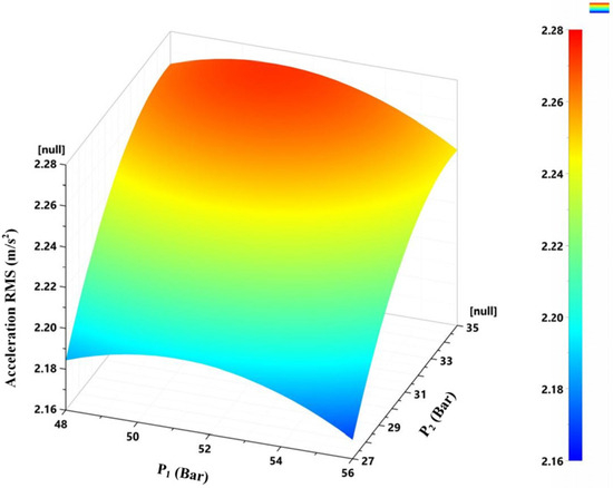 Acceleration RMS value as a function of the left and right accumulator pre-charge pressures.