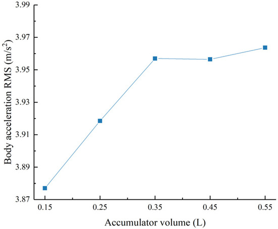 Acceleration RMS value as a function of the accumulator volume.