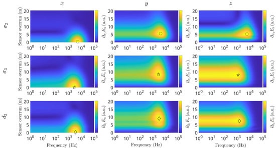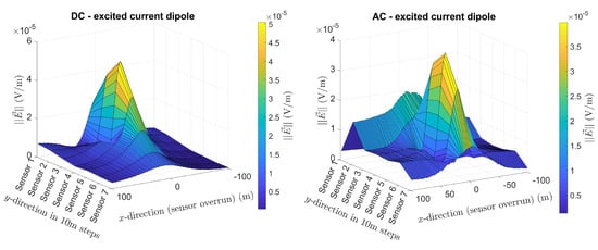 For each sensor, the values of the individual field components along the sensor overrun direction are determined, showing the maximum sensitivity values with dipole overrun position and frequency. Figure 6 shows the sensitivity for sensor 3, which is directly next to the source. The evaluation of the maxima are independent of any given unit, explaining why the color bars in the figure are given with an arbitrary unit (a.u.). As can be seen, the and components of sensor 3, the maximum sensitivity points are not directly orthogonal to the sensor, meaning that the best evaluation point can be found at a position before the object crosses the E-field sensors.