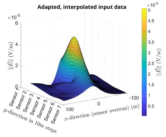 The inversion of the value results in a fraction, which, in the best case, has a denominator of zero if the test and reference systems are identical. To avoid an infinite fitness value, an infinitesimal value is added to the sum of the field values to prevent division by exactly zero. The fitness value given in Equation (9) can be used to compare a measured dipole overrun with the simulation model replicating the measurement site. Using the results from the sensitivity analysis from Section 4, the range of evaluation of the field data from the sensor overrun is limited and used for the fitness function at a single frequency of . The distance between the discretization points used on the sensor lines is gradually reduced from down to , a range which includes each sensitivity maximum of the sensors and maintains a distance to the first maximum at (see Figure 7).
