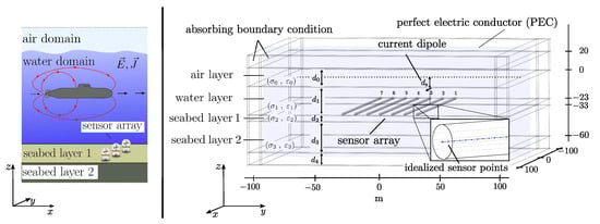The seawater is represented by a domain of 23 m thickness (adapted to the local conditions of the measurement site) and is followed by two seabed layers: the first is set to a thickness of 10 m as a starting value for the subsequent optimization process and the second has a vertical dimension of 50 m enclosed by the PML domain. To represent a sensor overrun of a moving vessel within the simulation model, a static current dipole is used within the software, combined with a sensor line containing multiple discrete points to record each position of the virtual overrun. Each sensor is represented by a single sensor line, which together form a virtual sensor matrix to record the electric field at each point. For further simplification, and to reduce simulation time, the symmetry of a dipole field is used in combination with the following boundary conditions to make the model numerically efficient: the air domain is replaced by an impedance boundary and, furthermore, the area is split using a PEC due to the normal components of the electric field directly at the symmetry plane. The outer boundary regions are placed as close as possible to the sensor-dipole region to reduce the simulation area. This also results in a truncated sensor line at a distance of . The described simulation model is shown in Figure 4 and is used for all further investigations.