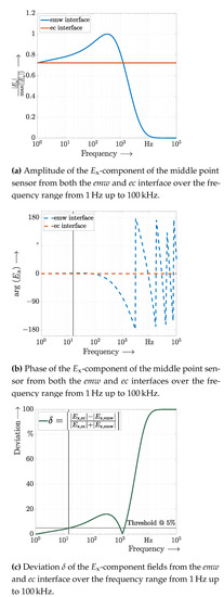 Simulated field coupling from the excitation and the recorded field of the two different COMSOL physics interfaces. The given field component is recorded at the middle point of the sensor line, which is orthogonally below the dipole excitation, and is visualized over the investigated frequency range. Both the emw and ec interfaces are shown on one coordinate system. (a) shows the amplitude, while (b) displays the phase. The difference between the two interfaces is shown in (c), which also shows that the threshold reaches its specified value at a frequency as low as .