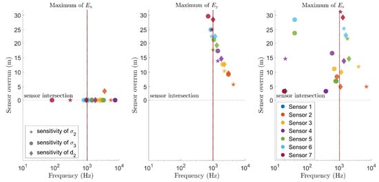 To elucidate the sensitivity maxima of all seven sensors in terms of their amplitudes, the maximum of each component of all the sensors is plotted in Figure 7. Here, the distribution of the sensitivity maxima from all seven simulated sensors is displayed over the frequency range and the overrun position. Figure 7 can be used to identify identical sensitivity maxima and find a frequency and position where as many sensors as possible have the highest sensitivity. This is done to reduce the search field and, thus, the parameter space, which ultimately saves computational effort. The narrowing and possible reduction is marked by a line in Figure 7. Looking at the best sensitivity points of the outboard sensors, it can be seen that the sensitivity maximum occurs at an overrun position that is further away from the array intersection and at a lower frequency. To capture additional information from the outer sensors, a fixed frequency of is defined for the best sensitivity of all sensors.
