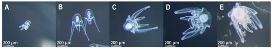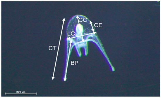 In addition to weekly larval stage assessment, the larvae were sampled (10% of the volume in the incubators) in all assays (D1, D2, and D3) at 10, 25, and 30 days post-fertilization (DPF) [14] to measure the following biometric parameters: total length (CT); body length (CC); body width (LC); post-oral arm length (BP); and stomach length (CE) following the method described by Kelly et al. [18] (Figure 2). Biometric parameters were represented as larvae stages pooled together, reflecting larval development.