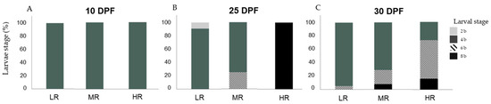 Assay D1: there were no significant differences in the larvae stage distribution among treatments (H1 = 0.000; p = 1.00) at 10 DPF. At this point, 100% (n = 422) of sampled larvae were at the development stage 4 b (Figure 3A). At 25 DPF, significant statistical differences were detected in the larvae stage distribution in the HR treatment when compared with LR and MR treatments (H1 = 3.319; p < 0.05) (Games–Howell tests; p < 0.05). In the LR treatment, 9.1% (n = 1) of the larvae were at the 2 b stage and 90.9% (n = 10) at the 4 b stage. In the MR treatment, 75% (n = 6) of the larvae were at the 4 b stage and 25% (n = 2) at the 6 b stage. The HR treatment showed that 100% (n = 2) of the sampled larvae were at the 8 b stage (Figure 3B). At 30 DPF, statistical analyses detected differences in the larvae stage distribution among treatments (H1 = 16.688; p < 0.05), these differences were significant among all treatments (Games–Howell tests; p < 0.05). In the LR treatment, 95.1 % (n = 77) of the larvae were at the 4 b stage and 4.9 % (n = 4) at stage 6 b. In the MR treatment, 71.1% (n = 54) of the larvae were at stage 4 b, 21.1% (n = 16) at the 6 b stage, and 7.9% (n = 6) at the 8 b stage. In the HR treatment 27% (n = 10) of the larvae were at the 4 b stage, 56.8% (n = 21) at the 6 b stage, and 16.2% (n = 6) at the 8 b stage (Figure 3C).