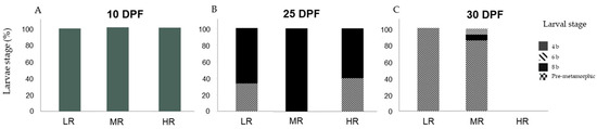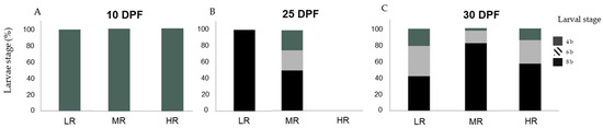 In assay D3, at 10 DPF no significant differences were detected in the larvae stage distribution among treatments (H1 = 0.000; p = 1.00). One hundred percent of sampled larvae (n = 270) were at development stage 4 b (Figure 5A). At 25 DPF, statistical analyses found no statistical differences in the larvae stage distribution among treatments (H1 = 1.750; p = 0.186). In the LR treatment, 100% (n = 3) of the sampled larvae were at the 8 b stage. In the MR treatment, 25% (n = 1) were at stage 4 b, 25% (n = 1) at the 6 b stage, and 50% at the 8 b stage (Figure 5B). At 30 DPF, larvae stage distribution among treatments was statistically different among treatments (H1 = 9.085; p < 0.05). These differences were statistically significant when compared to the LR treatment with the MR treatment (Games–Howell tests; p < 0.05). In treatment LR 21.1% (n = 4) of the larvae were at the 4 b stage, 36.8% (n = 7) at the 6 b stage, and 42.1% (n = 8) at the 8 b stage. In the MR treatment, 3% (n = 1) of the larvae were at the 4 b stage, 15.2% (n = 5) at the 6 b stage, and 81.8% (n = 27) at the 8 b stage. In the HR treatment, 14.3% (n = 1) of the larvae were at the 4 b stage, 28.6% (n = 2) at the 6 b stage, and 57.1% (n = 4) at the 8 b stage (Figure 5C).