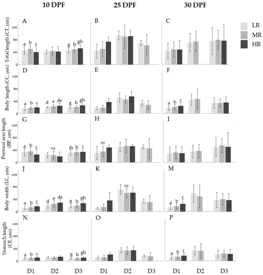 Mean (± DP) of the distribution of the biometric parameters: total length (CT), body length (CC), body width (LC), post-oral arm length (BP), and stomach length (CE) in microns (µm) registered in S. granularis larvae by treatment (LR, MR, HR) at 10, 25, and 30 days post-fertilization (DPF) for assays D1 (D. tertiolecta), D2 (R. marina), and D3 (D. tertiolecta and R. marina at a 1:1 cellular ratio) organized in subfigures (A–P). Significant differences (p < 0.05) in the distribution of biometric parameters among treatments are represented by superscript letters (a–i and non-significant differences (p > 0.05) are represented as ns. The absence of superscript letters indicates that there were no significant or non-significant differences in the distribution of biometric parameters among treatments.