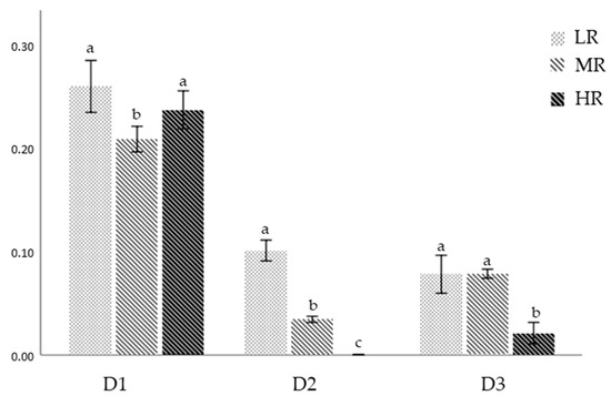 In assay D1, statistical differences were detected in the survival distribution among treatments. Survival in the MR treatment (0.20 ± 0.05%) showed to be significantly lower when compared to the LR and HR treatments (0.25 ± 0.11 and 0.23 ± 0.05%, respectively) (H2 = 36.356; p < 0.05) (Games–Howell tests; p < 0.05) (Figure 7). In assay D2, there were significant differences in the survival distribution among all treatments (H2 = 37.780; p < 0.05), showing higher survival at LR (0.10 ± 0.02%). On the contrary, survival was negligible at HR (0.00 ± 0.00%) (Games–Howell tests; p < 0.05) (Figure 7). Assay D3 showed significantly higher survival in the LR and MR treatments (0.07 ± 0.03 and 0.07 ± 0.01%, respectively) when compared with the HR treatment (0.02 ± 0.01%) (H2 = 19.841; p < 0.05) (Games–Howell tests; p < 0.05) (Figure 7).