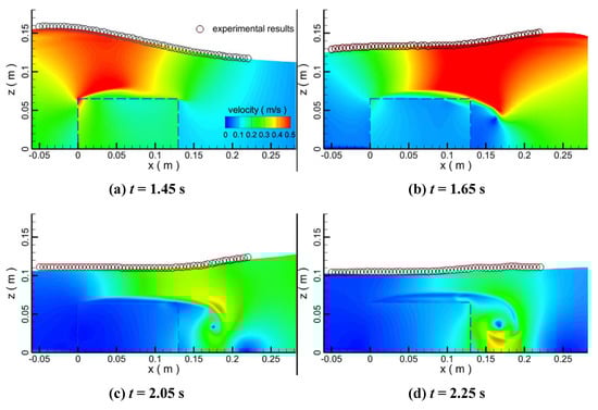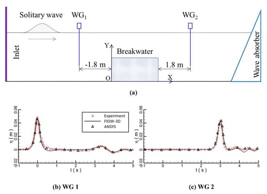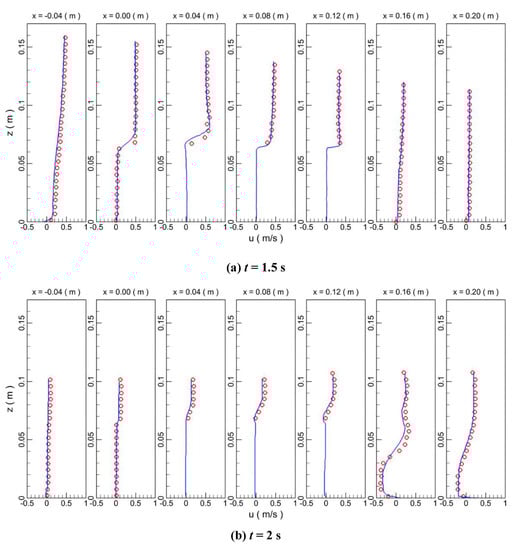 An experimental test on the propagation process of a solitary wave over a permeable breakwater was performed by Reference [], which was simulated in this study to validate the adopted two-way coupling model (Figure 1a). The length, width, and depth of the flume tank were 25, 0.5, and 0.6 m, respectively. A permeable breakwater was mounted at the bottom of the flume, which had dimensions of 13 cm and 6.5 cm in the length and height, respectively. The porous breakwater with an average porosity of 0.52 was configured by glass beads with a constant diameter of 1.5 cm. Two wave gauges were fixed before (WG1) and behind (WG2) the breakwater, respectively. The initial still water depth h was assumed to be 10.6 cm. Height of the solitary wave H was considered to be 4.77 cm. In the numerical model, the calculation zone had dimensions of 5 m in length and 0.25 m in height. The second order quadrilateral mesh elements were adopted. The grid around the breakwater was the finest of 0.001 m. The adopted time step size was 0.05 s. The numerical predictions of the water elevations at the locations WG1 and WG2 by the adopted numerical tool FLOW-3D are close to both the experimental measurements and the numerical predictions from another CFD FLUENT version 14.0.1 [] (Figure 1). Figure 1b,c show the comparison of monitored water levels at the two water level monitoring points in Figure 1a. It can be seen that the experimental results of the two monitoring points are consistent with the numerical simulation results, indicating that the propagating solitary wave energy is basically completely dissipated and then flows out. If the propagating wave energy is not dissipated, the phenomenon of wave reflection will occur. The waves monitored at the two monitoring points will appear superposition of propagating waves and reflected waves. The numerical simulation results do not agree with the physical experiment results. The fluctuations of the water surface elevation after the bypass of the incoming wave are due to its residual reflection at the right absorbing boundary condition, which arrives at WG2 at an earlier time than WG1. Evolution of the wave surfaces was also compared between the experimental and the numerical models (Figure 2), which demonstrates that the numerical tool is sufficiently reliable. The velocity of the wave is reduced by the porous medium as it partially infiltrates into the breakwater, which is shown as in Figure 3 by comparing the horizontal velocity distributions between the experimental and numerical results at times of 1.5 s and 2 s. The numerical predictions of the flow velocities have slight discrepancies with the experimental measurements, which are attributed to the material assumptions made in the numerical model for the glass beads in the experimental setup.