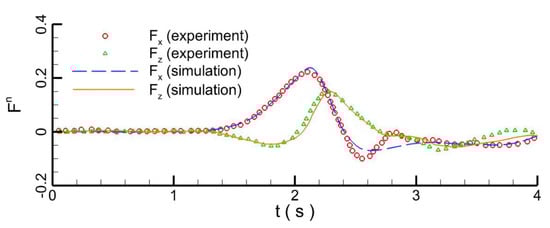 Another experimental test of a solitary wave impacting a pipeline was performed by Reference [], which was also reproduced in this study for validation purposes. The calculation zone had dimensions of 40 m in length and 0.6 m in height. The solitary wave had a height of 0.0555 m with the initial water depth of 0.192 m. The pipe had a diameter of 0.048 m, which had a distance of 0.136 m over the bottom boundary of the model. A dense mesh consisting of 413,411 cells was employed with a mesh size of 0.1 mm around the pipe, which proved to be sufficiently fine through convergence studies. History of the horizontal and vertical forces, normalized by ρgL(πD2/4) with L as the unit length of 1 m, is compared between the experimental and numerical results (Figure 4). Both the peak values and the transient variations of the forces predicted by the numerical analysis converge to the measured values in the experimental test. The slight discrepancy between the numerical and experimental results at 2.5 s and 3.1 s, which may be induced by the error of the numerical model simulating the complicated turbulence behaviour, is acceptable in relation to the requirements of this study as our concern is mainly the peak values of forces.