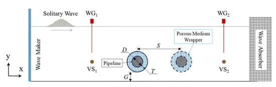 Influence of the solitary waves on the performance of wrapped pipelines was investigated by considering different wave heights (H) and thicknesses (T) and wrapper porosities (n). The still water depth (h) was taken to be 6 m (Figure 5). The diameter of the porous medium was assumed to be 0.05 m. The pipeline diameter D was set at 1 m. In Figure 5 the variable G represents the gap between the permeable wrapper and the seabed. The scouring process had been completed before the simulation; therefore, the seabed boundary was taken as a rigid wall. The tandem pipelines had a distance of S between each other. The whole model had dimensions of 400 m in length and 12 m in height. The finest mesh around the pipeline was configured as 0.0025 m, which was verified to be sufficiently fine through trial calculations with finer meshes.