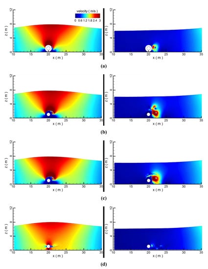 Six gaps (G) between the wrapper and the seabed (0.0, 0.2, 0.4, 0.6, 0.8, and 1.0 m) were considered [,,]. The representative flow field at three points in time (6.3, 7.2, and 10.2 s) are shown in Figure 16. At the arrival of the wave at the pipeline (at 6.3 s), the flow is accelerated and the velocities over and beneath the pipe reach the maximum values due to the bypass effect of the fluid. At the moment that the wave peak is above the pipe (at 7.2 s), all the velocities around the pipe reach their highest values. After the wave passes over the pipe (at 10.2 s), the velocity decreases and several vortices are formed behind the pipeline. With a tiny wrapper-seabed gap, the velocity within the gap is very high while the flux is relatively small. An increase in the gap will result in an increase in the flux and a decrease in the velocity. A symmetric velocity distribution similar to a fisheye is observed behind the pipeline, which becomes more obvious when the gap increases (Figure 16c).