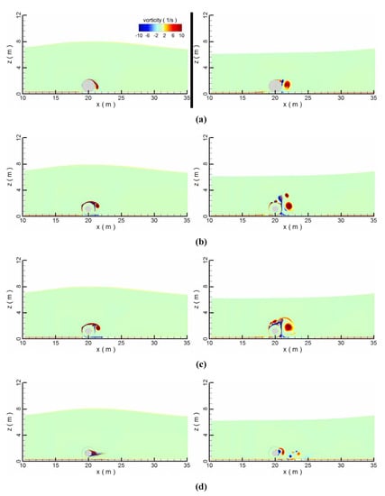 The vorticity contours of the flow fields under different porosities; (a) n = 0.0; (b) n = 0.4; (c) n = 0.6; (d) n = 1.0; left to right: arrival, departure.