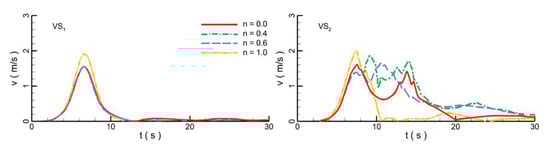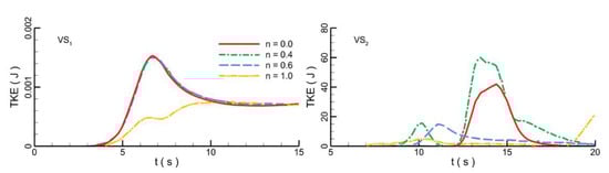 The peak velocity around the pipeline without a wrapper (1.9 m/s) is larger than that with a wrapper (1.6 m/s) (Figure 8). For pipes with wrappers, the peak velocities around them are similar to one another. In contrast, the velocity profiles at x = 23 m are quite different. When the pipeline has no wrapper (i.e., n = 1.0), the change in velocity is fairly moderate. When the pipeline has a wrapper, the porous wrapper causes a secondary fluctuation in the rear water body after the primary fluctuation due to the peak of the wave passing through the pipeline. This generates a series of velocity peaks. The secondary velocity peaks for a porosity coefficient of 0.4 are higher than those for a porosity coefficient of 0.6. Accordingly, the turbulent kinetic energy (TKE) also changes with the porosities, as shown in Figure 9. The TKE is expressed as