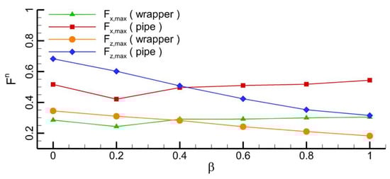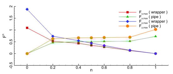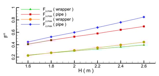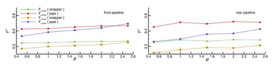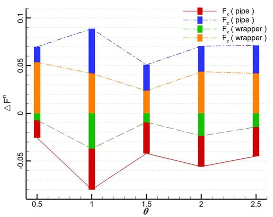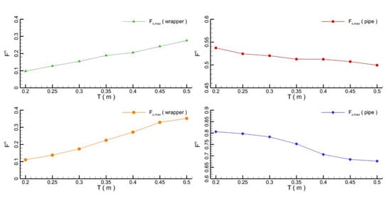 With an increase in the wrapper’s thickness, the hydrodynamic forces on the wrapper tend to increase. In particular, the horizontal forces on the pipeline decrease with an increase in the thickness due to the protection of the wrapper, while the vertical forces are increased because of variations in the fluid’s stagnation point.