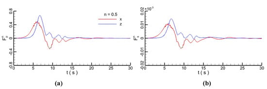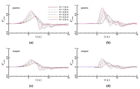 At the bypass of the wave through the pipe, the loads are increased until they reach the maximum values at the moment that the wave peak appears above pipeline (Figure 24). The forces gradually decrease as the wave propagates. Because of some reflux after the wave bypasses the pipeline, the flow is in the opposite direction to that of the wave propagation, resulting in a negative force. The vibration of the water body by the wave propagation induces oscillations of the forces on the pipeline and wrapper. When the wave height is larger, the force oscillation becomes fiercer and the maximum loads on the pipeline and the wrapper increase (Figure 25). The vertical forces on the pipeline are the largest compared with other forces under the same conditions. Besides, as the wave height increases, the increased amplitude of vertical forces on the pipeline is the most significant change since the weight of the water above the pipeline increases. Therefore, given that the wave height is very high, the protective function of wrapper on the pipeline tends to be weakened compared with that of the wrapper for a low wave height.