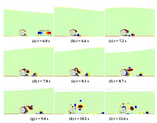 Seven wrapper thicknesses are considered: T = 0.2, 0.25, 0.3, 0.35, 0.4, 0.45, and 0.5 m. The porosity coefficient is taken to be 0.6. At the moment that the wave goes through the pipe, the transient evolution of the vorticity contours around the pipeline with a wrapper thickness of 0.25 m is depicted in Figure 12. A couple of vortices emerge on the upper and lower vertices of the pipeline as the wave approaches the pipeline. As the wave propagates, many vortices flow along the wrapper and then shed off. Compared with the top vortices, the bottom vortices are shed off faster for two reasons. Firstly, as the friction at the seabed is small, the bottom flow velocity is higher than that on the top. Secondly, when the wave peak departs from the pipeline, a strong disturbance by the water body occurs behind the pipeline, followed by the irregular swing and fall off of the vortices. After the wave travels far away, the water flow near the pipeline becomes weak, and the vortices are scattered around the pipeline.