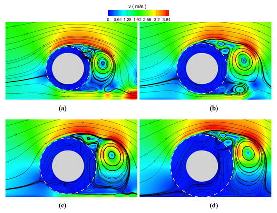Comparisons of flow field streamtraces and velocity contours under different wrapper thicknesses; (a) T = 0.2 m; (b) T = 0.3 m; (c) T = 0.4 m; (d) T = 0.5 m.