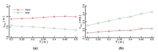 The highest free surface elevations and velocities at the front and at the rear of the pipeline with different wrapper thicknesses are depicted in Figure 14. As the wrapper thickness increases, the highest elevation at the front of the pipeline seems to be quite stable, although the peak velocity increases by around 6%. At the moment that the wave bypasses the pipeline, the maximum elevation reduces with an increase in the wrapper thickness. This is because the pipeline blocks the wave propagation. However, due to the strong mixing effect of the seepage and bypass water, the maximum velocity rises to be higher than that in front of the pipe. The maximum forces on the wrapper and the pipeline for different wrapper thicknesses are shown in Figure 15. With an increase in the wrapper thickness from 0.2 to 0.5 m, the normalized forces on the wrapper are doubled as a larger interaction area is involved. In contrast, the vertical forces on the pipeline decrease by 12.5%. Therefore, the larger the thickness of the wrapper the safer the pipeline.