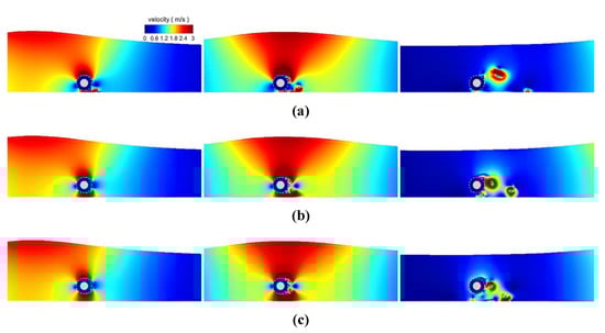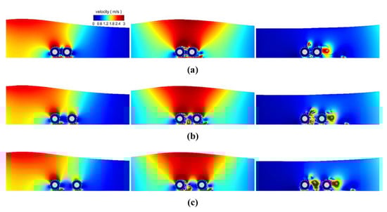 The velocity contours of the flow fields under different spacings; (a) S = 2.5 m; (b) S = 3.5 m; (c) S = 4.5 m. Left to right: 6.3 s, 7.2 s and 10.2 s.