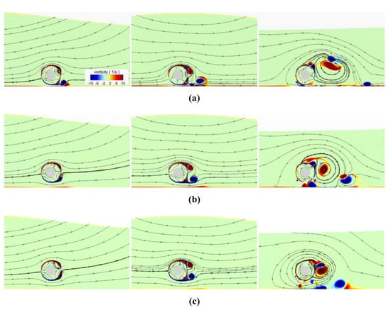 With the bypass of the wave, the vortices generated around the pipeline become larger. The vorticity contours and the streamlines of the flow field are shown in Figure 17. As the solitary wave approaches, a pair of whirlpools shed off from the wrapper with a gap of 0.2 m. With an increase in the gap, the two whirlpools gradually disappear and are replaced with two smaller vortices. Due to the internal pores within the wrapper, the streamlines in the wrapper are dispersed, and it is hard for a vortex to be generated. With an increase in the gap, two anti-symmetric vortices shed off from the wrapper. Besides, some tiny vortices remain adhered to the wrapper due to the interaction by the seepage and the external flow. When the gap is very small, a few small vortices are generated between the wrapper and the seabed. In contrast to the interface of vortex from the flow around a solid cylinder, the vortex interface at the wrapper is not fully smooth. Because of the strong interactions of fluid over the wrapper surface, several small vortices mingle with the large shedding vortices. The flow direction also varies greatly according to the streamline mobilisation.
