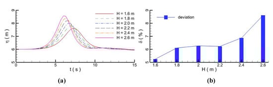 Waves with different wave heights; (a) temporal evolutions; (b) attenuation deviation.