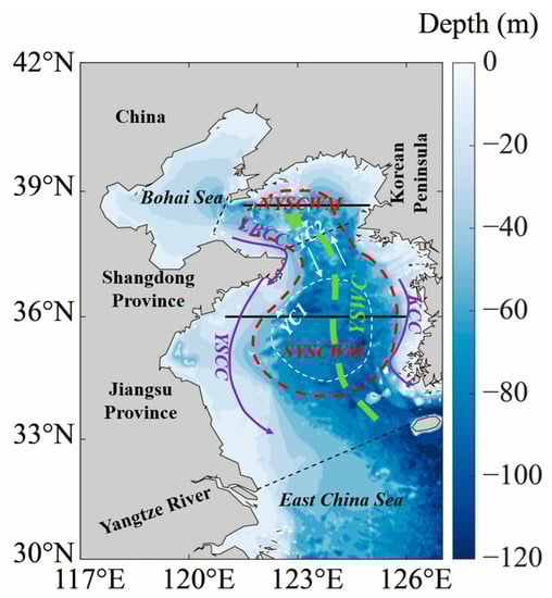 The Yellow Sea (YS) is a shallow and semi-enclosed marginal sea in the Pacific Ocean (Figure 1). There are sorts of water masses and ocean currents in the YS, which are forced primarily by the East Asian Monsoon, rainfall, solar radiation, tide-induced mixing, river runoffs, and large-scale circulations in the Pacific Ocean via the Kuroshio Current [15,16,17]. Especially strong stratification is established due to increasing solar radiation, where a volume of cold water with a seawater temperature (ST) lower than a certain value, is retained from the previous winter below the thermocline in summer [18,19]. This cold water, called the Yellow Sea Cold Water Mass (YSCWM), occupies nearly the entire bottom layer of offshore waters [16,18]. The YSCWM is formed by the combination of the northern YSCWM (NYSCWM) and southern YSCWM (SYSCWM), where the boundary between the NYSCWM and SYSCWM is defined as the line between Chengshan Cape on the Shandong Peninsula and Changshan in Korea (Figure 1). Since the evolution and intensity of the YSCWM significantly influence the nutrient concentrations, primary production, and aggregation and migration of fish in surrounding seawater, it would be useful to know the variability of the YSCWM on a longer-term scale in advance.