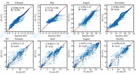 To verify the accuracy of the ST from GLORYS, the surface and vertical profile data were matched with the satellite SST data from MODIS-Aqua and the in situ data from KODC, respectively (Figure 2). Details of the data matchup process were described by Stepanova et al. [35]. Briefly, a time window of ±30 days was used between the two datasets (in situ and satellite data) and the ST from GLORYS, and a median value from a 3 × 3-pixel box centered at each sampling site was applied to filter the sensor and algorithm noise. Finally, only the matrix with a coefficient of variability less than 0.4 was retained, and the average value of the matrix was calculated; this represented the matched data for the ST from GLORYS. Figure 2 shows that the ST from GLORYS fitted well with the satellite SST and in situ data from KODC, and the coefficient of determination was consistent with the results obtained by Stepanova et al. [36] (R2 > 0.80). Therefore, the ST from GLORYS was used to explore the horizontal and vertical distributions of the ST in the YS, thereby providing important support analyses of the spatial and temporal distributions of the YSCWM [37].