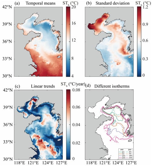 The spatial distribution of the STb in the YS averaged from 1993–2019 is shown in Figure 3a. Spatially, the STb gradually decreased from the inshore to the center of the YS, with a mean value of 13.03 °C. The minimum (3.45 °C) occurred in the northern YS and the maximum (19.31 °C) occurred in the inshore water. The standard deviation of the detrended annual STb exhibited stronger interannual variability in the YSCWM than in surrounding waters (Figure 3b). On the interannual scale, the enclosure area surrounded by each isotherm shrank in the YSCWM. In particular, the enclosure area surrounded by isotherms at 10 °C shrank the most rapidly, followed by those at 9 °C and 8 °C, and shrank most slowly at 12 °C (Figure 3d). In addition, we fitted a linear function to the STb and calculated the linear trends. The interannual variability of the STb was stronger in the NYSCWM than in the SYSCWM (Figure 3c). The results show that the annual warming trend was stronger in the SYSCWM than in the NYSCWM, which were converse with the pattern of annual STb, probably due to the differences in the physical oceanographic conditions between the NYSCWM and SYSCWM, as discussed in Section 4.2.