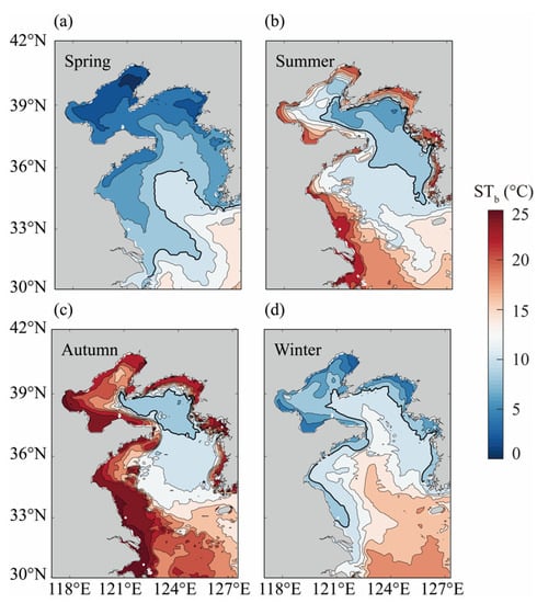 Climatological seasonal mean STb in the YS. (a) Spring, (b) Summer, (c) Autumn, and (d) Winter. The interval of the thin black contour lines is 2 °C, and the 10 °C contour is the thick black line.