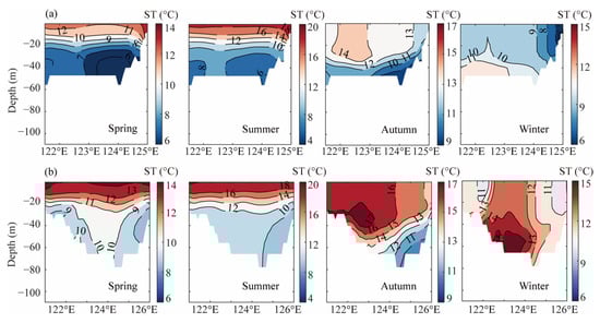 Vertical structures of seasonal mean ST in sections. (a) 38.667° N section and (b) 36° N section.