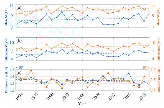 Interannual variability in the intensity of the YSCWM. (a) Mean STb, (b) minimum STb, and (c) enclosure area. The blue lines represent the characteristic parameters of the NYSCWM. The orange lines represent the characteristic parameters of the SYSCWM. The dotted lines represent the linear trend in the characteristic parameters of the NYSCWM and SYSCWM.