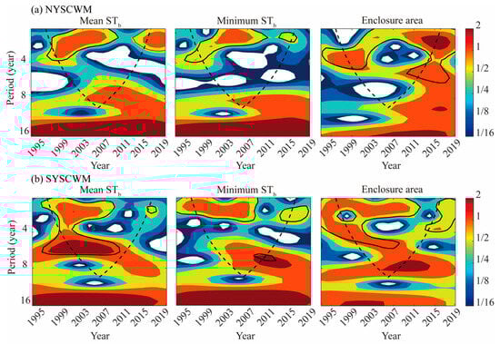 The CWT was used to determine the periods of the three characteristic parameters of the NYSCWM and SYSCWM on the interannual scale. For the NYSCWM, the mean STb had the strongest periodic signal of about 3 years, where it mainly appeared from 1995 to 2009. There was no obvious periodic signal for the minimum STb after 2011. The periodic signal in the enclosure area was a strong periodic signal for 2–6 years in the whole study period (Figure 7a). For the SYSCWM, the mean STb had a strong periodic signal of 2–6 years, which mainly appeared in 1995–2009. The minimum STb had a strong periodic signal for 2–3 years, but there was no periodic signal after 2009. The periodic signal in the enclosure area was discontinuous in 1993–2019, and there were 2–6 years of periodic signals in 1993–2011, but only 2–3 years after 2011 (Figure 7b).