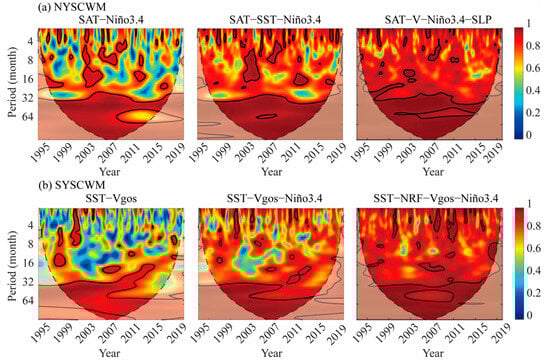 In this study, the calculation of the MWC between the mean STb and physical environmental factors (two-, three-, and four-factor) resulted in differences in the main factors influencing the variability in the intensity of the NYSCWM and SYSCWM (Figure 6). Table 2 summarizes the combinations of physical environmental factors (two, three, and four factors) that best explain the variability in the intensities of the NYSCWM and SYSCWM. For the NYSCWM, among all possible two-factor combinations, the SAT–Niño 3.4 combination was the best at explaining the variability in intensities at the 32–64-month time scale (about 3–5 years), and it was accompanied by an increase in the coherence and PASC (Table 2). These results indicate that the intensity variability was affected by the ENSO on the interannual scale (Figure 8). Many studies also detected an especially high mean STb and low enclosure area in ENSO years, as well as higher SAT and SST values and weaker winds in the YSCWM [21,31,46]. However, when the PASC increased as the coherence increased for the best combinations of three and four factors, the increases in the PASC were both <5%, thereby indicating that the additional factors were not considered significant or meaningful [47].