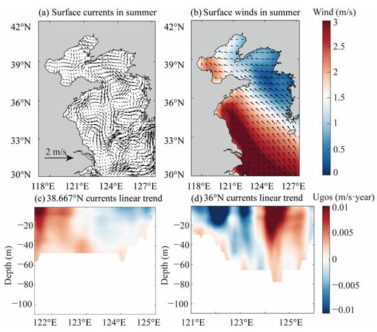 (a) Surface currents and (b) surface winds in summer (June–August). The linear trend in the mean Ugos, (c) 38.667° N section and (d) 36° N section, in 1993–2019.