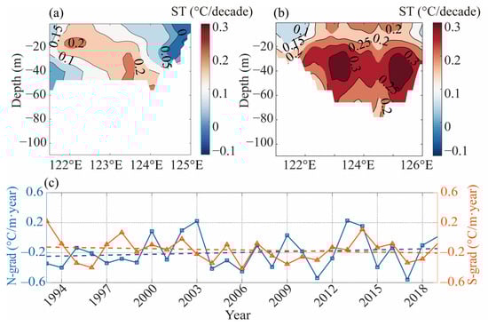 In addition to the effects of the circulation, the thermocline could also affect the differences in the chemical and hydrographic characteristics between the NYSCWM and SYSCWM [22,58]. The thermocline affects the YSCWM by regulating vertical stratification and stability. A stronger or deeper thermocline can impede vertical mixing between water layers, leading to more distinct water masses with varying temperatures and salinities. This thermocline variation, in turn, can influence the density gradients that drive current patterns in the YS [59]. We calculated the linear trends in the ST along the 38.667° N section and 36° N section in August (Figure 10a,b). The trend in the surface ST of the NYSCWM and SYSCWM both increased at the rate of 0.1 °C/decade and 0.2 °C/decade at a 95% significance level, and its correlation coefficient with STb was −0.68 and −0.64 in the NYSCWM and SYSCWM. Lateral heat input in the bottom layer weakened. The increasing trend in the SST and less warm water intrusion intensified the thermocline. Further, we calculated the vertical temperature gradient. The average vertical gradients with a water depth of 20–30 m above the NYSCWM and SYSCWM were regarded as the thermocline intensities [31]. The linear trends in the thermocline intensities increased at a rate of 0.004 °C/m/year in the NYSCWM and decreased at a rate of −0.003 °C/m/year in the SYSCWM at a 95% significance level, which meant that the amplitude of variation in the thermocline depth of the NYSCWM was stronger than that in the SYSCWM, especially after 2009 (Figure 10c). The correlation coefficient of the amplitude of variation in the thermocline depth and STb was −0.64 and −0.54 in the NYSCWM and SYSCWM. A stronger thermocline generated less vertical heat exchange across it. Less warm water intrusion reduced the horizontal heat input. This may have resulted from the weakening of the circulation in the NYSCWM in summer. An increasing surface ST and less bottom-layer horizontal heat input enhanced the seawater temperature difference between the surface and bottom layer. The stronger thermocline in the NYSCWM inhibited vertical heat exchange, which weakened the transfer of heat from the surface to the deep layer, thus weakening the STb during NYSCWM warming in summer. Therefore, the intensity of the SYSCWM decreased more rapidly than that of the NYSCWM.