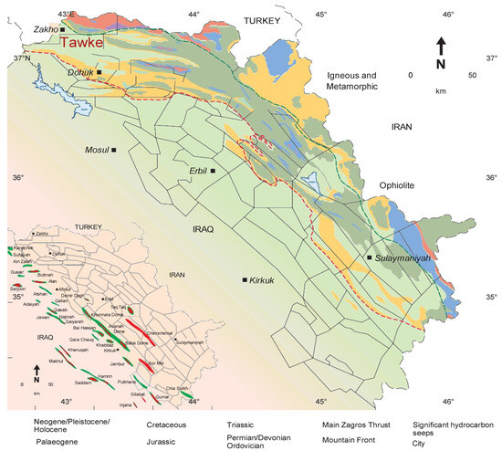 General geological map showing the location of the studied Tawke area [14], the red and green zones are represented oil/gas fields.