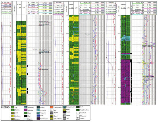On the other hand, the lithologic pattern charts of the log show a laminated shale mudstone, which is one of the basic compositions of the rocks. Clay and organic material associated with shale play significant role in petroleum origin. The mineralogical composition of clay and shales associated with a high enough quantity of organic constituents cause adsorption, forming a dominant source material and, consequently, act as catalysts in oil/gas generation [16]. Furthermore, there is diagenesis of claystone and clay transformation during this stage (i.e., from montmorillonite to mixed-layer montmorillonite/illite, and then to illite). High contents of illite and mixed layers are conducive to enhancing gas or oil adsorption because the clays have strong adsorption capacity [17,18].