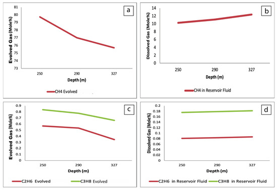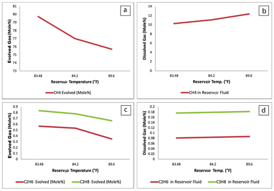 Figure 4b,d show that the amount of natural gas dissolved in reservoir fluids increases during an increase in the reservoir temperature. This proportional relationship could be attributed to increasing gas solubility and reservoir temperature, thus enhancing the degradation rate of organic compounds, leading to the formation of more dissolved gas in the reservoir. However, the phenomena are inversed for the evolved gases, as shown Figure 4a,c.