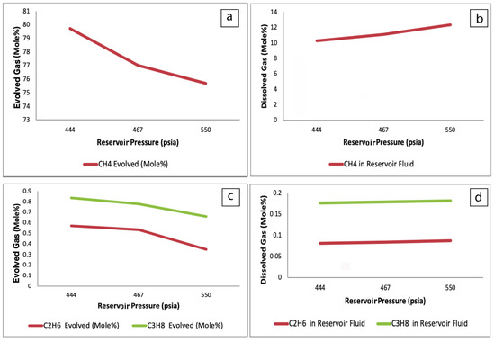 (a,c) Amount of evolved gas; (b,d) amount of dissolved gas (i.e., Ch4, C2H6, C3H8) versus pressure of reservoir.