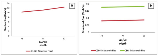 Amount of dissolved gas versus gas–oil ratio (a) CH4 in reservoir fluid; (b) C2H6 and C3H8 in reservoir fluid.