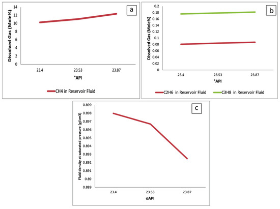 The change in °API with the quantity of natural gas dissolved in reservoir fluid is shown in Figure 7a. It is obvious that as the amount of dissolved natural gas increases, a remarkable increase in °API is observed, while a decrease in density is recorded. The dissolving of light hydrocarbon gases other than carbon dioxide in reservoir fluids decreases the density and, consequently, increases the °API of the fluids. In general, petroleum density is denoted in terms of °API. There is an inverse relationship between °API and oil density; an increase in °API is generally accompanied by a decrease in oil density. Figure 7b shows the situation of the samples investigated.