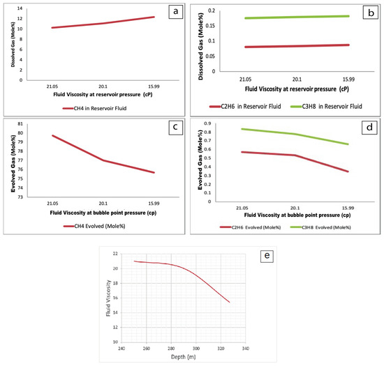 (a,b) Fluid viscosity at reservoir pressure, (c,d) at bubble-point pressure, and (e) as a function of well depth.