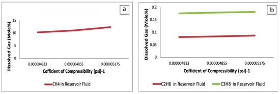 Amount of dissolved gas versus coefficient of compressibility (a) CH4 in reservoir fluid; (b) C2H6 and C3H8 in reservoir fluid.