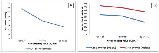 Amount of evolved gas versus gross heating value (a) CH4 evolved gas; (b) C2H6 and C3H8 evolved gas.