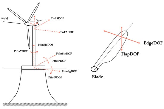 As explained in [25], the DOF determines the physical phenomena simulated, the degree of variability of the signals, and thus the fidelity of the simulation. Normally, considering more DOFs gives more reliable results, but, in contrast, it also increases the computational cost. In a wind turbine, the main physical phenomena that can be included or neglected in the simulation are the bending of the various system elements, the deformation of the blades, and the translation and rotation of the platform. A complete list of DOFs that can be configured in OpenFast is shown in Table 2 and illustrated in Figure 2.