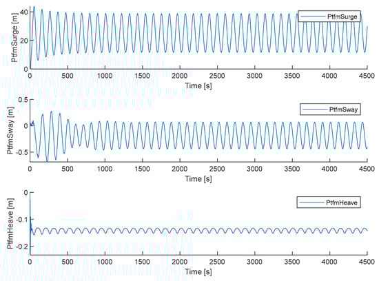 The simulation time of the experiments is 4500 s. However, the first 1500 s are discarded as a warm-up initial period (transient part of the signal) due to the fact that the platform oscillation and rotation signals need some time to reach the steady state. Figure 5 and Figure 6 show the main displacement and rotational responses of the FOWT. It is possible to observe the transitory behavior during the initialization.