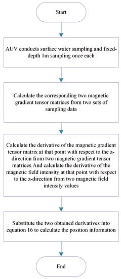 The vertical gradient algorithm proposed in this paper is illustrated in Figure 3. This method primarily involves using the AUV’s vertical ascent and descent movements to perform two rounds of magnetic data collection. Subsequently, vertical differencing is applied to the magnetic field intensities collected by the magnetic sensors, aiming to minimize the influence of the geomagnetic field, and calculate the partial derivative along the Z-axis of the magnetic gradient tensor matrices obtained from the two acquisitions. This process allows for the determination of the position information of magnetic targets. The time complexity of the vertical structure magnetic gradient algorithm in this paper is O(1). In a horizontal structure, it is necessary to first measure the numerical value of the background magnetic field and then estimate the magnetic anomaly field of the target object before incorporating it into Equation (13) for calculation.