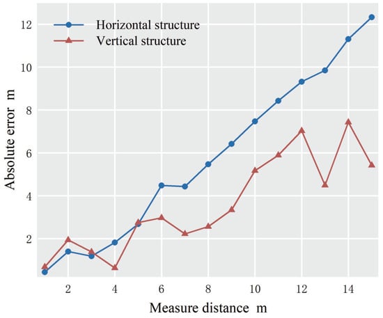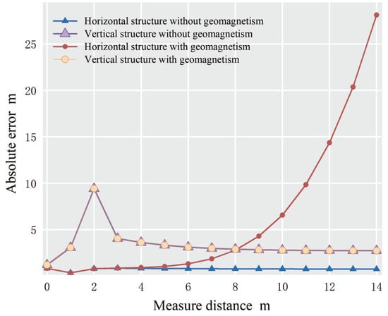 The following Figure 5 illustrates a comparison of localization simulation results for the two structures. The abrupt error change at a distance of 2 m is due to the presence of specific field points around the magnetic dipole, causing the tensor matrix to become singular and resulting in the failure of the positioning method. In the absence of background magnetic field noise, both the horizontal and vertical structures demonstrate a favorable localization performance. When introducing 40,000 nT of magnetic field background noise, the horizontal structure experiences increasing positioning errors with the extension of the detection distance. In contrast, the vertical structure exhibits a superior positioning performance. Especially beyond the 8-m mark, the horizontal structure positioning method is significantly affected by the background magnetic field, and its performance deteriorates sharply. The vertical structure positioning algorithm described in this paper, on the other hand, does not directly utilize the measured magnetic field intensity data in the position vector calculation. Instead, it uses the data of its vertical differences. As a result, even in distant scenarios, it can still effectively extract the magnetic anomaly information generated by the magnetic anomaly. Therefore, it maintains good positioning accuracy in long-distance situations.