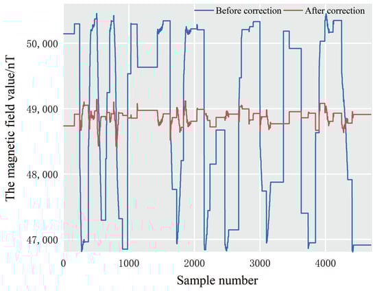 Due to the interference from the AUV’s own magnetic properties and time-varying noise during data collection, the measured data exhibit significant fluctuations [33,34]. The collected data are corrected using the Ocean Predator algorithm. In Figure 8, the gray line represents a set of experimental measurement data with a fluctuation range of 46.65 T to 50.48 μT and a variance of 1,791,836.522. The red line represents the magnetic field data after calibration using the Ocean Predator algorithm, with a fluctuation range of 48.45 T to 49.23 T and a variance of 10,894.87499. After calibration, gradient values are calculated to perform magnetic source localization.
